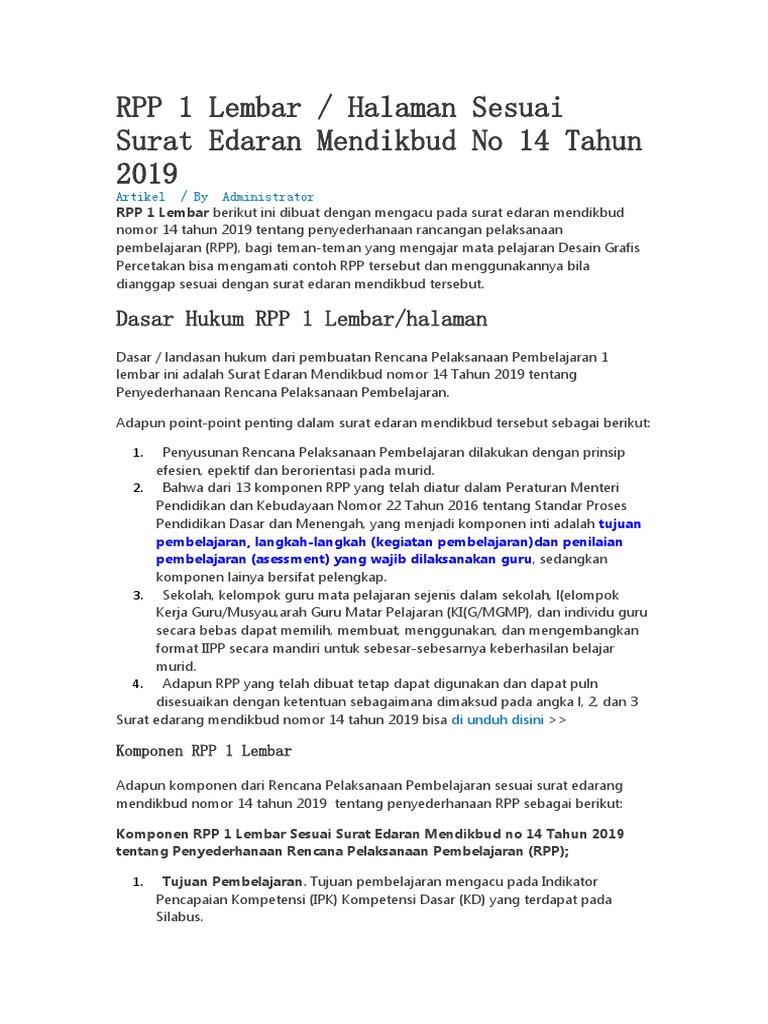 Pada umumnya, surat ini bertujuan untuk menyampaikan sebuah informasi dari pengirim kepada penerima surat tersebut. Pada kesempatan kali ini kami akan berbagi informasi mengenai rencana pelaksanaan pembelajaran (rpp). Mengenai rpp 1 lembar tertuang dalam surat edaran nomor 14 tahun 2019 menteri pendidikan dan kebudayaan ri nadiem anwar makarim yang dikeluarkan pada hari senin tanggal 10 desember 2019. Berikut ini adalah prediksi contoh rpp 1 lembar yang sesuai edaran no. Adapun contoh formatnya bisa anda.